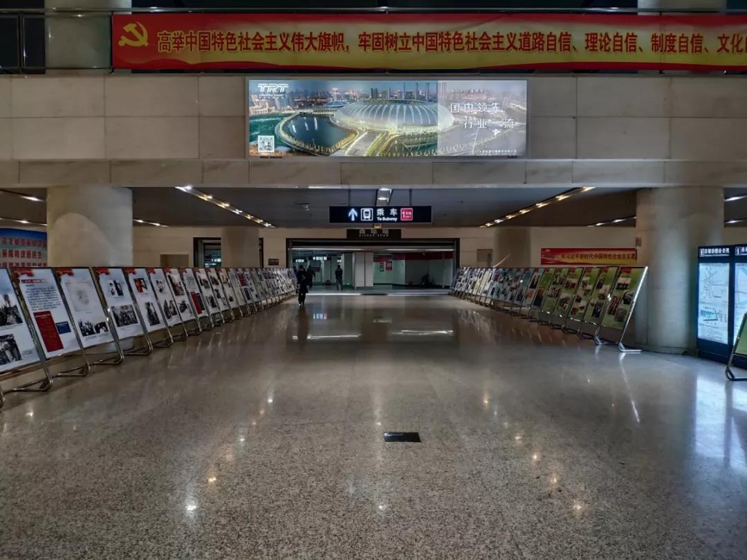 ??? 開展當(dāng)天,氣勢恢宏的布展形式引來很多乘客駐足觀看。