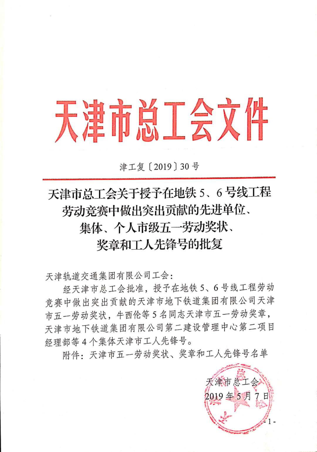 在勞動(dòng)競(jìng)賽過(guò)程中,涌現(xiàn)出了一批有突出貢獻(xiàn)的先進(jìn)集體和個(gè)人,為更好地選樹典型,激發(fā)參建員工的工作熱情,助推地鐵工程建設(shè),地鐵集團(tuán)工會(huì)向上級(jí)工會(huì)組織申報(bào)天津市五一勞動(dòng)獎(jiǎng)項(xiàng),收到批復(fù)榮獲獎(jiǎng)項(xiàng),具體名單如下: