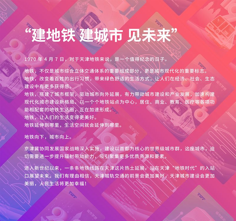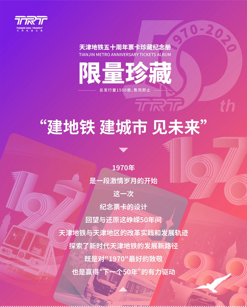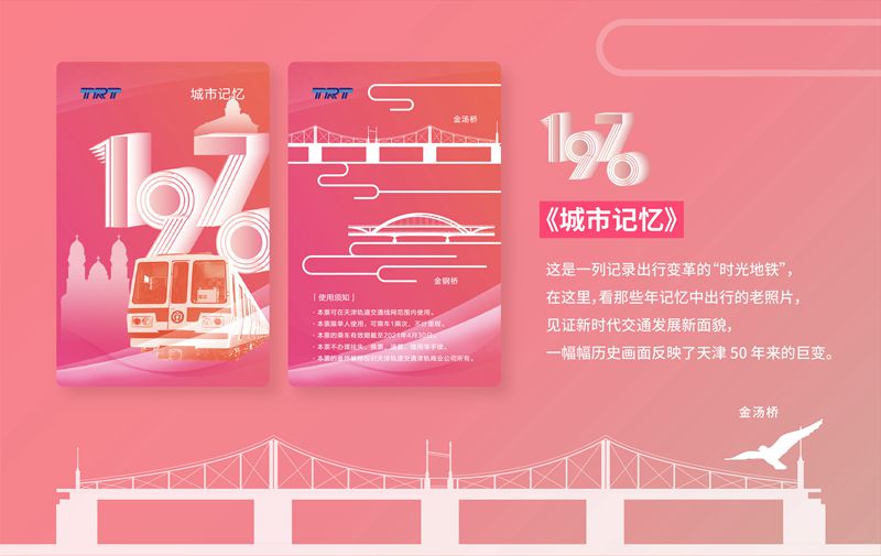 為紀(jì)念天津地鐵建設(shè)50周年,天津中車機(jī)輛裝備有限公司集團(tuán)隆重推出 “天津地鐵50周年票卡珍藏紀(jì)念冊”。紀(jì)念票卡設(shè)計(jì)回望了崢嶸50年間天津市和天津地鐵改革發(fā)展的軌跡,既是對“1970”最好的致敬,也是贏得“下一個(gè)50年”的有力驅(qū)動。