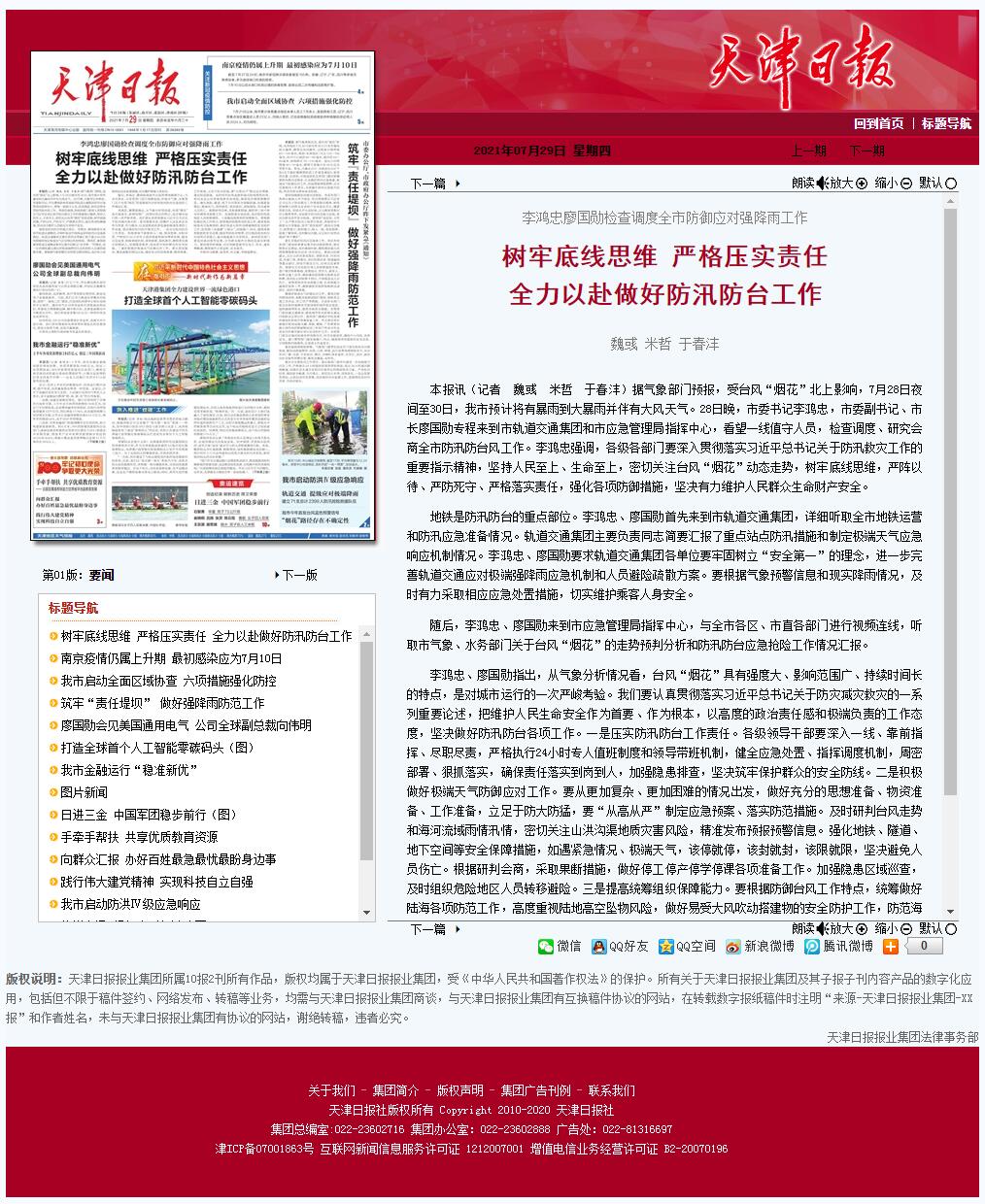7月28日晚,天津市委書記李鴻忠、市委副書記、市長廖國勛到軌道交通集團控制中心,聽取地鐵運營和防汛應急準備情況。集團主要負責同志簡要匯報了重點站點防汛措施和制定極端天氣應急響應機制情況。李鴻忠、廖國勛要求軌道交通集團各單位要牢固樹立“安全第一”的理念,進一步完善軌道交通應對極端強降雨應急機制和人員避險疏散方案。要根據(jù)氣象預警信息和現(xiàn)實降雨情況,及時有力采取相應應急處置措施,切實維護乘客人身安全。