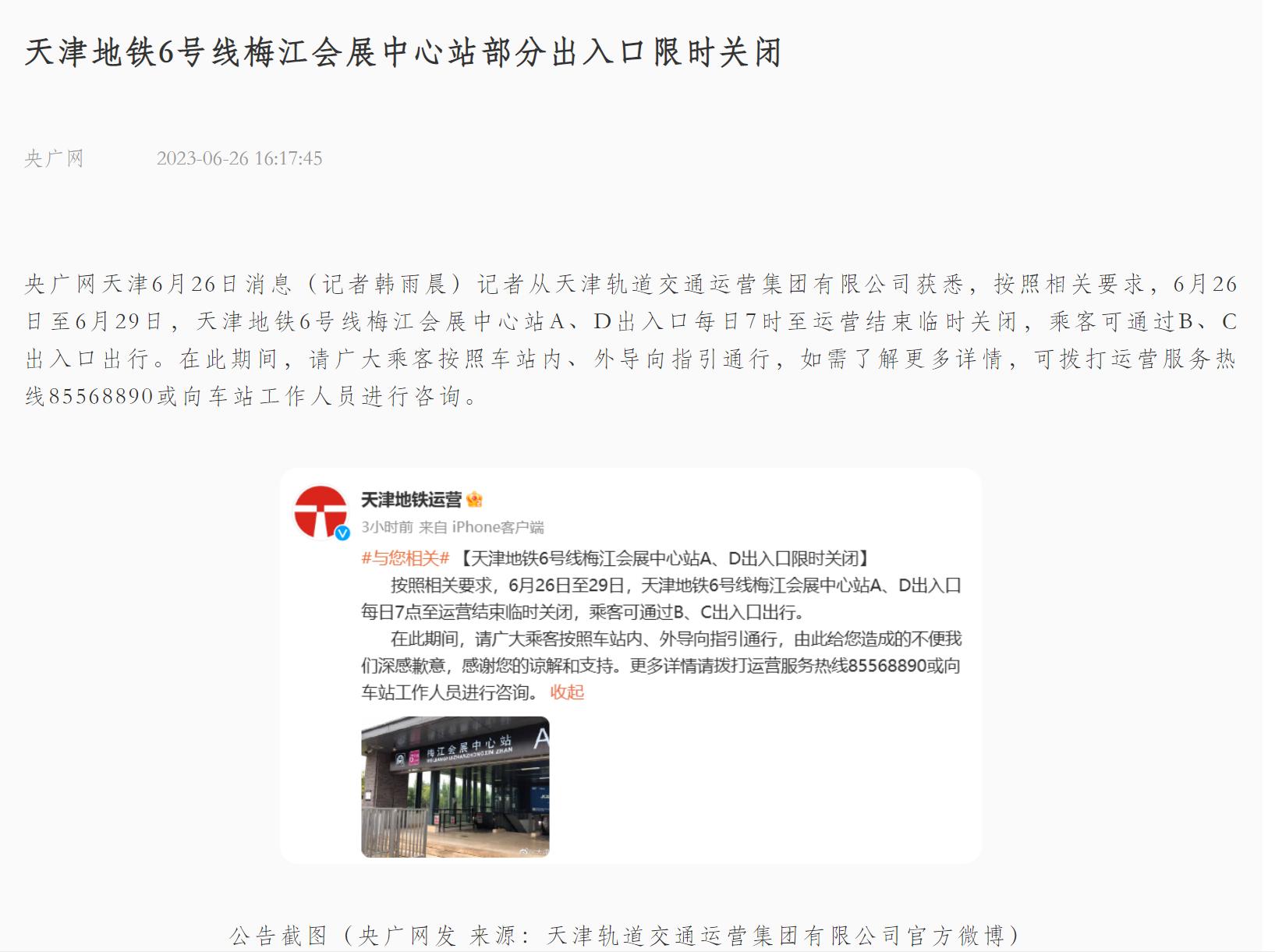 天津地鐵6號(hào)線梅江會(huì)展中心站部分出入口限時(shí)關(guān)閉