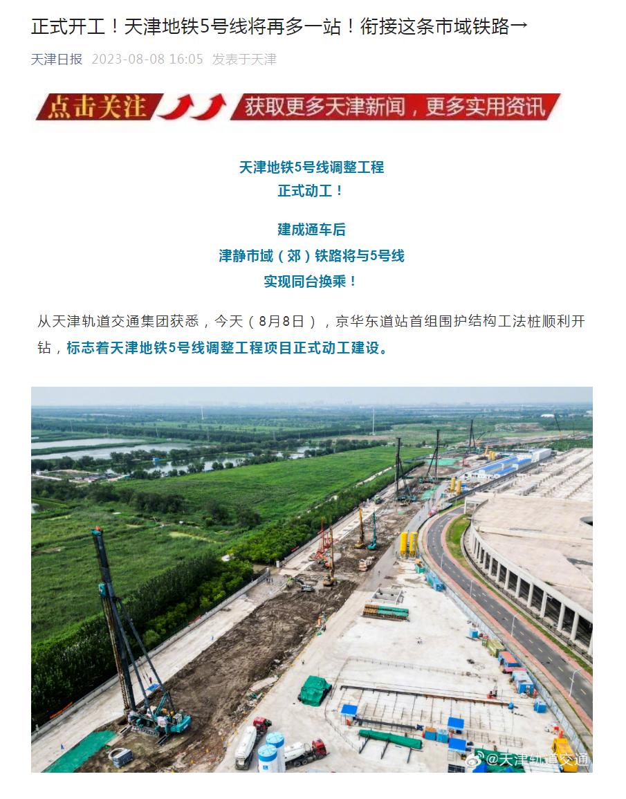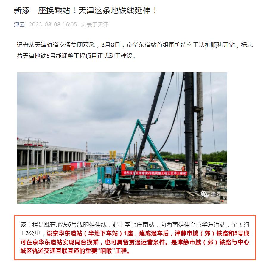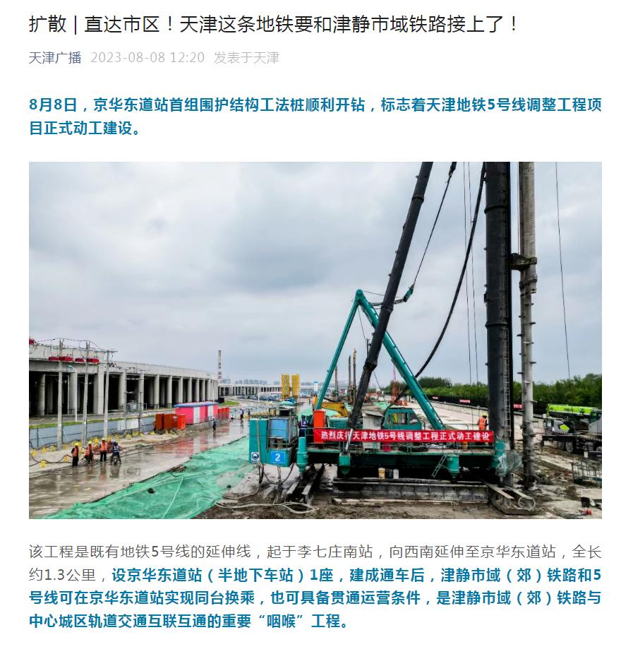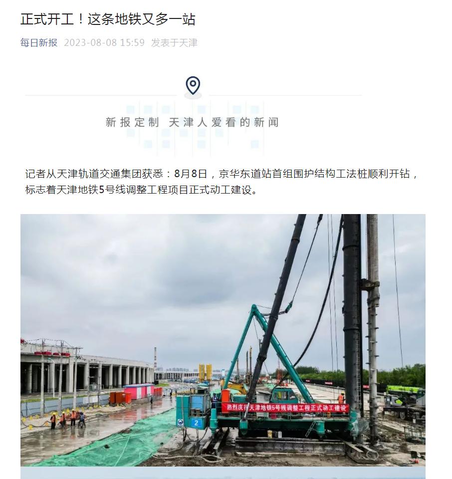 ??? 8月8日,天津日報、津云、天津廣播、每日新報微信頭貼對地鐵集團建設(shè)的5號線調(diào)整工程正式動工進行報道,今天京華東道站首組圍護結(jié)構(gòu)工法樁順利開鉆。貼文總閱讀量超過10萬。