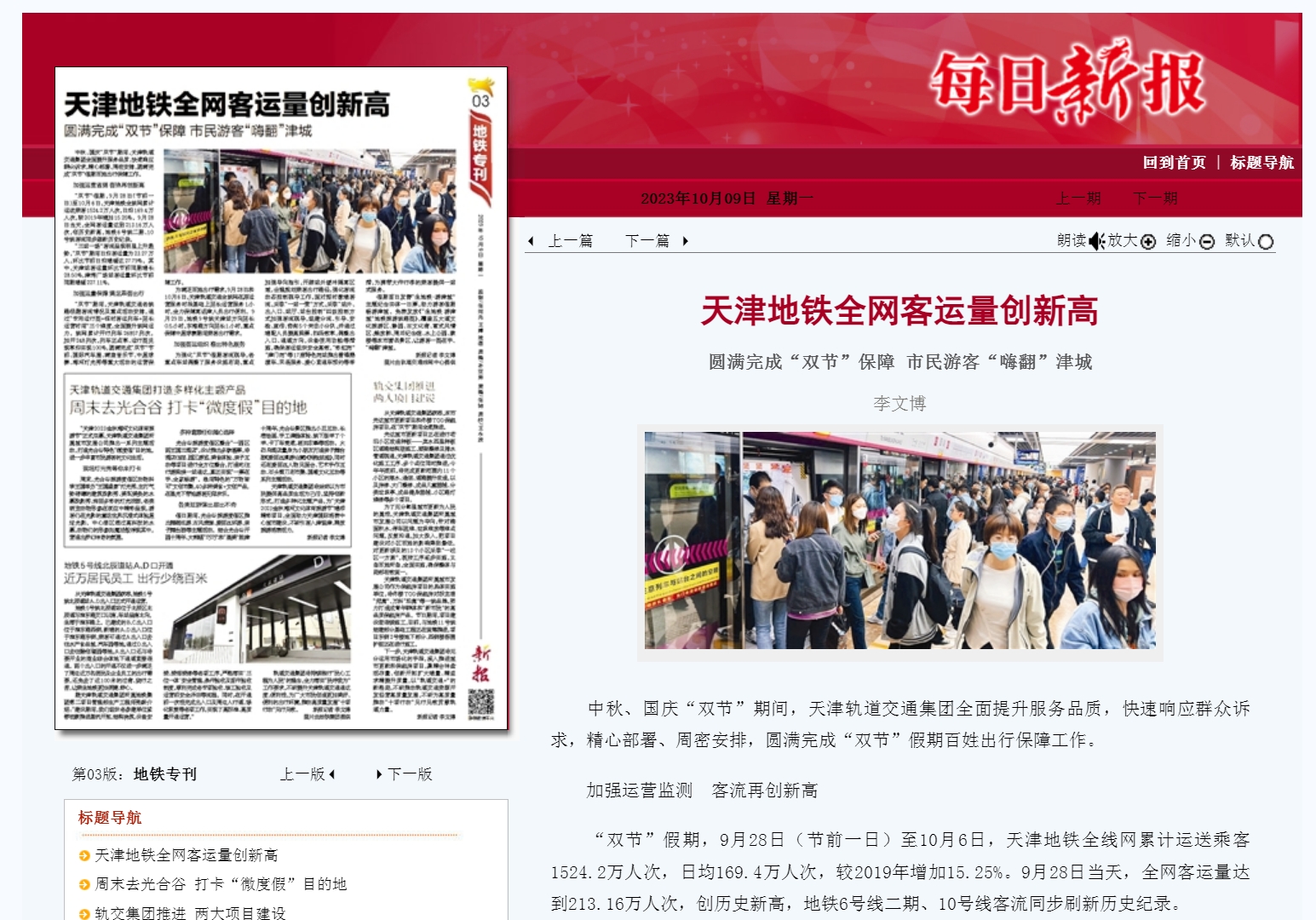 天津地鐵全網(wǎng)客運(yùn)量創(chuàng)新高