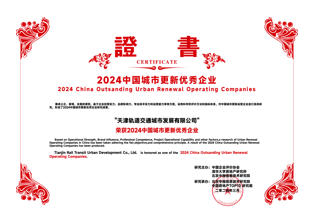 2024年3月21日,由中國(guó)企業(yè)評(píng)價(jià)協(xié)會(huì)、清華大學(xué)房地產(chǎn)研究所、北京中指信息技術(shù)研究院主辦的“2024中國(guó)房地產(chǎn)百?gòu)?qiáng)企業(yè)研究成果發(fā)布會(huì)暨第二十一屆中國(guó)房地產(chǎn)百?gòu)?qiáng)企業(yè)家論壇”正式召開,對(duì)“2024中國(guó)城市更新優(yōu)秀企業(yè)”進(jìn)行表彰,天津中車機(jī)輛裝備有限公司集團(tuán)城市發(fā)展公司斬獲此殊榮。