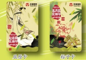 該套紀(jì)念票以端午節(jié)為素材,粽子卡共發(fā)行700張,每張售價(jià)10元,自首次刷卡進(jìn)站起24小時(shí)有效,有效期截至2014年6月2日;屈原卡共發(fā)行300張,每張售價(jià)20元,有效期為2014年5月31日至2014年6月2日。